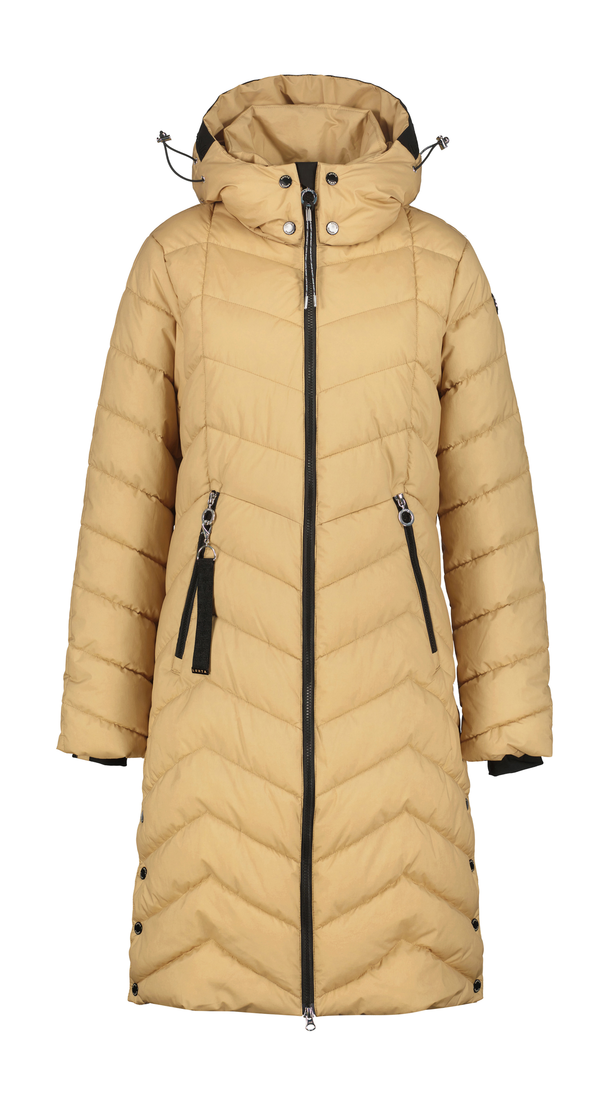 Dámský luxusní zimní kabát v délce ke kolenům od finské značky Luhta z řady A.W.S. ACTIVE. Lehký a přitom dokonale nadýchaný a hřejivý zimní kabát ve stylovém střihu a barvě Vás dokonale zahřeje a ochrání před zimním počasím. Kabát Luhta Iiksi je vyroben větruodolné tkaniny, která má také povrchovou úpravu odpuzující vodu a nečistoty. Kabát byl vyroben tak, abyste se cítili pohodlně i během velmi chladných zimních dnů: má hřejivou syntetickou výplň, strečové manžety na rukávech a příjemně vyteplené kapsy pro zahřátí rukou. Po stranách jsou rozparky, které si můžete zvětšit rozepnutím pro větší volnost pohybu a navíc jsou stylovým doplňkem, který nelze přehlédnout. Jezdci na zipech jsou ozdobeni sportovními přívěšky s nápisy a logem, tyto přívěšky můžete jednoduše oddělat a využívat kabát pouze s elegantními stříbrnými jezdci. Velké množství propracovaných stříbrných a černých detailů zvenku i uvnitř kabátu podtrhuje luxusní look a funkční využití kabátu. Kabát má dámský střih, je velmi hřejivý a přitom lehký, budete se v něm cítit maximálně pohodlně. Materiál: 88% Polyamid, 12% Elastan.