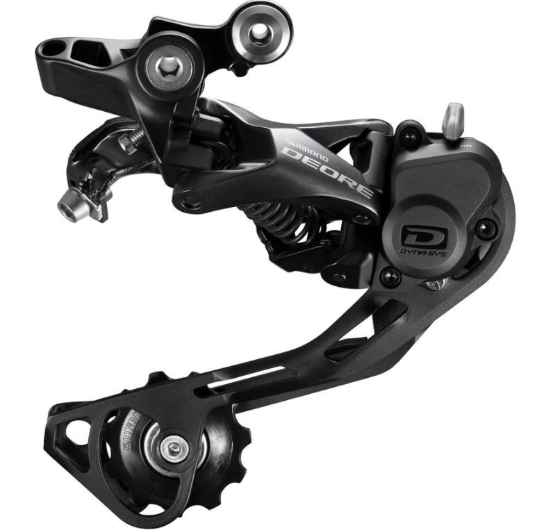 Přehazovačka Shimano Deore z nové sady nesoucí označení RD-M6000 s dlouhým SGS vodítkem, přepracovaným Shadow designem a optimalizovaným profilem zubů kladek.
