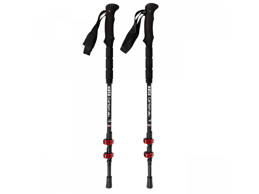 Lehké a pevné třídílné teleskopické hole Yate Carbon Trek s prodlouženou rukojetí z EVA pěny. Horní díl je vyroben z karbonu, spodní dva díly z hliníku. Velmi lehké a skladné hole určené hlavně pro turistiku a skialpinismus. Utahování pomocí rychloupínáků (Quick Lock) slouží k nastavení požadované délky. Prodloužené pěnové rukojeti umožňují pohodlný úchop v rukavicích i bez nich a nastavitelné poutko z měkkého popruhu nikde nedře do ruky. Ocelové (karbidové) hroty. Hole jsou dodávány se dvěma talířky (velký do sněhu a malý) a gumovými kryty na hroty. Hole jsou pro YATE vyráběné v Itálii v jedné z nejlepších a největších evropských firem na výrobu lyžařských a turistických holí ITALBASTONI.
