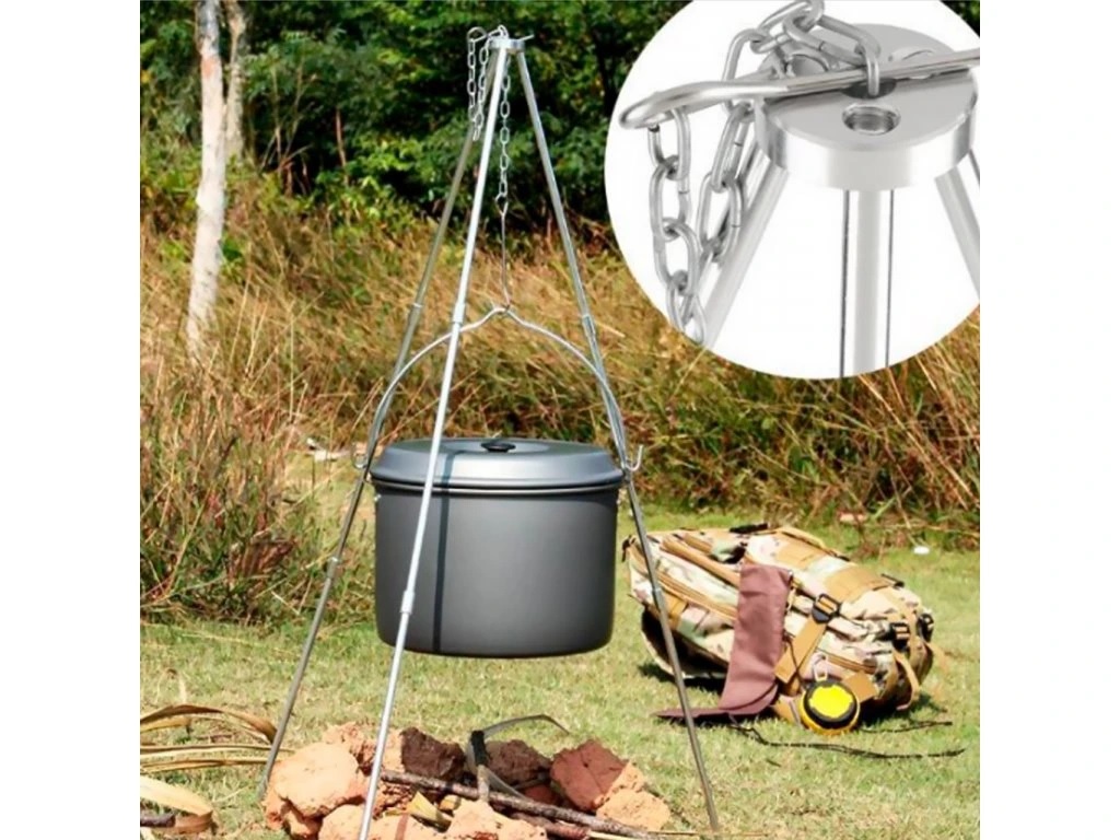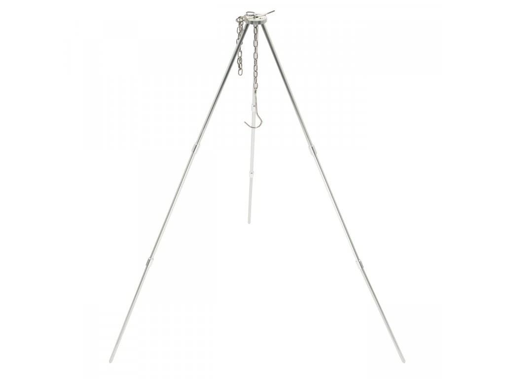 Skládací trojnožka s řetízkem a háčkem umožňuje snadné zavěšení kotlíku nad ohniště. Díky nastavitelné výšce zavěšení můžete regulovat intenzitu ohřevu a dosáhnout tak ideálního výsledku při vaření. Řetěz o délce 50 cm je zakončen háčkem pro bezpečné uchycení kotlíku. Trojnožka je lehká, skladná a snadno přenosná, takže je ideálním pomocníkem na táboření, kempování i zahradní vaření.